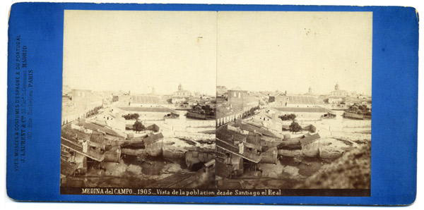 Las cinco vistas tomadas en Medina del Campo corresponderían a esta última etapa de su producción y fueron obtenidas con una cámara de doble objetivo que permitía realizar, de forma simultánea, las dos imágenes en una sola toma, logrando un efecto estereoscópico de gran calidad. Hay que recordar que las fotografías quizá fueran obtenidas realmente por Alfonso Roswag, hijo político de Laurent y “segundo fotógrafo principal” de la Compañía, ya que desde 1873 Jean Laurent no solía viajar fuera de Madrid. Gracias a esta técnica fotográfica de gran realismo podemos contemplar, tanto la monumentalidad de la fortaleza de la Mota desde ángulos opuestos (desde el Oeste y el Este); la imagen general del conjunto urbano en el que descuellan varias torres y espadañas actualmente desaparecidas, como las de San Facundo, Sta. María del Castillo, Santa Ana, etc.; o la apariencia finisecular de la Medina del último cuarto del Ochocientos, en la que todavía perviven las antiguas fachadas asoportaladas de la Plaza Mayor y la Rúa, que siguen las normas del ordenamiento urbano de la tercera década del siglo XVI.