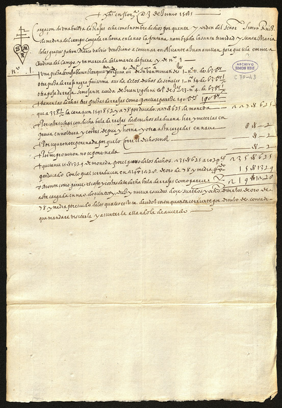 En ocasiones es frecuente la participación de algunos criados en los negocios -siempre en un porcentaje limitado- empleando la marca de empresa en las operaciones particulares. Esto sucede en el caso de Lope de Arziniega, hombre de casa de Simón Ruiz, que une sus iniciales a la marca del trébol de su señor para marcar de esta forma los bultos que le pertenecen. Los dos documentos que presentamos son dos cargazones en las que se detalla la mercancía a transportar, el número de fardos y la marca con la que van señalados; asimismo, el puerto de origen y de destino y el nombre de la nao que los transporta con el nombre del consignatario a quien se le entregará la mercancía para hacerla llegar a Medina del Campo. También se anotan los costes de la operación: precio de la mercancía y gastos de embalaje, transporte y aduanas. En ambos casos se trata del envío de productos textiles a cargo de Simón Ruiz. En uno de ellos se detalla que se trata de dos fardos de lienzos ruanes blancos muy finos con destino el puerto de Bilbao, consignados a nombre de Bartolomé del Barco para hacer la voluntad de Simón Ruiz, que llevan como marca dentro del trébol una S y encima del nº una *. El otro documento refiere el envío de tres piezas de rajas florentinas, unos paños ricos de lana muy apreciados en Castilla, embarcados en Livorno con destino Alicante en un bulto consignado a nombre de Juan Avellán que lleva como signo de Simón Ruiz una marca de “4 de cifra” con una cruz de dos travesaños y debajo un corazón trilobulado que tiene inscritas las letras S y M, cada una en un círculo, y una R en punta.