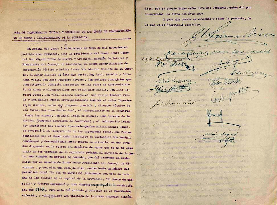 En el acta oficial de este acto el letrado-secretario del Ayuntamiento refiere los nombres de las autoridades nacionales, alcalde y concejales que forman la “Comisión inspectora de las obras”, técnicos y concesionarios de las mismas, todos ellos presentes en la explana del Castillo de la Mota; y hace mención de la bendición de las obras por parte del arzobispo de Valladolid, la “tongada de mortero de cemento” que arroja el presidente del Consejo de Ministros a una cavidad dispuesta en la solera del futuro depósito de aguas, donde también se entierra una caja de zinc con un ejemplar del semanario local “La Voz de Castilla” y los diarios “El Norte de Castilla” y Diario Regional” y tres monedas. Al final del texto firman todos los intervinientes.