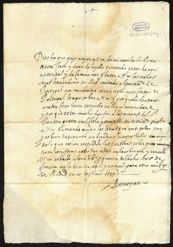 Pinto abandonó la Ciudad Eterna en diciembre de 1588 dejando a su sobrino, Francisco Vaz Pinto, en el puesto de agente, llegando a España probablemente en enero de 1589. En la carta aquí comentada, fechada el 10 de junio de 1589, Pinto revela que al dejar Roma pensaba dirigirse a Portugal y, de paso, saludar a Simón Ruiz, pero no lo hizo por haber recibido la orden del Rey de incorporarse al Consejo de Portugal. Pinto permaneció cerca de la Corte en Madrid donde murió en 1592. En esta carta pide a Simón Ruiz que le mande las copias de las cuentas pendientes de Antonio da Fonseca (ca. 1535-1588) mercader banquero portugués que fue socio de Pinto en el “mercado curial” durante su estancia romana (1556-1588). Junto con Fonseca, de hecho, fueron los más importantes banqueros ibéricos en la Ciudad Eterna que velaban por los intereses de los clérigos que querían obtener, intercambiar o vender beneficios eclesiásticos en España y Portugal. El Archivo Simón Ruiz conserva numerosas letras de cambio de sus clientes al igual que cartas entre Pinto, Fonseca y el mercader burgalés. Tan estrecho fue el vínculo entre estos dos hombres que, de hecho, en su testamento de 1586 Fonseca nombró a Pinto ejecutor de sus últimas voluntades encargándole la administración de su herencia y sus intereses comerciales, aunque su hijo Manuel Fernandes da Fonseca (ca. 1556-1625) fuera su heredero. Al pedir a Simón Ruiz la gestión de las cuentas de Fonseca, Pinto actuaba de acuerdo con lo estipulado en su testamento.