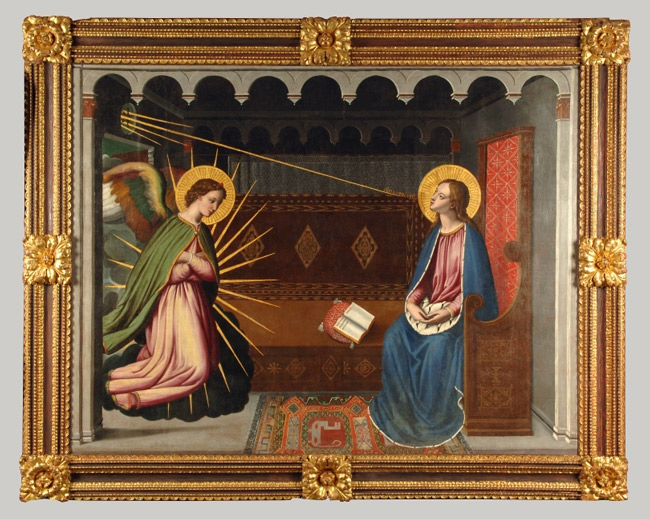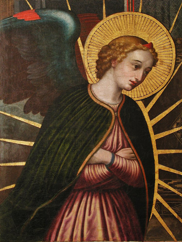 La tabla central, de perfil mixtilíneo en su parte superior, presenta una hermosa y repetida composición que muestra en el centro a la Virgen con el Niño sentada en un trono con dosel. A su lado la figura de San José en un segundo plano, sostiene libro y anteojos en sus manos, equilibrándose con la representación de un ángel que ofrece al Niño un racimo de uvas, en evidente alusión eucarística. Las tablas laterales se dedican a los dos fundadores mendicantes, Santo Domingo de Guzmán y San Francisco de Asís, sobre el mismo fondo de paisaje que los unifica con la tabla central. De diferente complexión física, ambos santos podrían parecer realizados por manos distintas. La observación detallada permite sin embargo afirmar que responden a un idéntico tratamiento, corroborando la idea de tríptico.