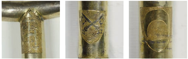 El primero de los anillos contiene dos escudos: uno papal, con las llaves de San Pedro, y otro -junto a una cartela con el nombre de “BENEDICTO XIIIº”- con las armas del célebre Papa Luna (Pedro de Luna, pontífice entre 1378 y 1414), elegido por los prelados disidentes de Avignon y defensor en su momento de Fernando de Antequera en el Compromiso de Caspe. En el segundo anillo aparece nuevamente el escudo pontificio, esta vez junto al del antipapa “CLEMENES VIIº” (Robert de Genève, 1378-1394) opositor del romano Urbano VI. Por último, en la tercera abrazadera, aparece de nuevo del blasón cortado en punta con las armas del Papa Luna, sin inscripción alguna, acompañado del escudo con las llaves de San Pedro.