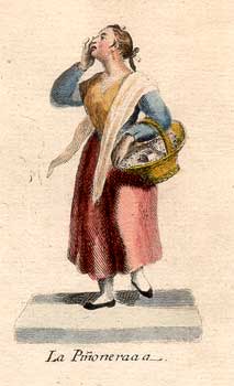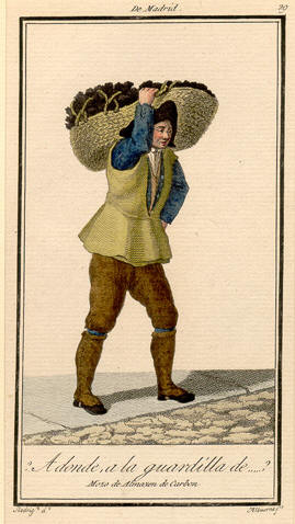 En el primero de ellos, el dedicado a los vendedores ambulantes y sus «gritos de la calle», se recogen estampas de personajes con sus mercancías, procedentes de colecciones tan conocidas como: la de los hermanos Juan y Manuel de la Cruz Cano y Olmedilla (Colección de trajes de España, 1777), fuente inspiradora de otras muchas imágenes de tipos y personajes populares; la Colección General de los Trages publicada por el artista valenciano Antonio Rodríguez, en series en las que participaron otros grabadores de renombre como Vázquez, Martí o Albuerne; y Los gritos de Madrid, colección de calcografías de Miguel Gamborino publicada entre 1809 y 1817, elenco muy representativo de los vendedores del mercado madrileño de aquellos años, bajo cuyas figuras aparecen los «gritos» o pregones con los que ofrecían sus mercancías o servicios. Otros oficios y profesiones son recogidos en estampas publicadas en colecciones de láminas de trajes, como las calcografías de José Rivelles y Juan Carrafa (1825) o las litografías de Paul Hadol («White») y Langlumé, sobre pinturas de Pigal, publicadas en París en torno a 1860. Cierra este capítulo la colección completa de xilografías compuestas por Fco. Javier Ortego y Tomás Carlos Capuz, publicadas a lo largo de 1861 en la revista El Museo Universal bajo el título genérico de «Comercio ambulante de Madrid».