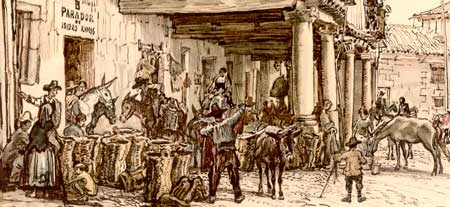 Un segundo conjunto agrupa estampas de gran calidad técnica, compuestas por dibujantes y pintores viajeros, en su mayoría de procedencia francesa y anglosajona, que llegan a España por razones diversas, pero siempre influidos por las ideas románticas tan de moda en aquel momento. Buscan edificios monumentales, rincones pintorescos, personajes de leyenda y costumbres ancestrales con que ilustrar futuras publicaciones que se imprimirán generalmente en sus países de origen. Ante estas circunstancias, no cabe duda que el ambiente de los mercados callejeros y las ferias semanales serán escenarios propicios donde llevar a cabo sus rastreos. Entre otros artistas de este género citamos a Edward Hawke Locker (1777-1849), David Roberts (1796-1864), Harry Fenn (1845-1911),.. y, con ellos, al más célebre de los paisajistas románticos españoles, el gallego Jenaro Pérez de Villaamil (1807-1854). Por sus obras conocemos de primera mano los «azogues» y plazas de mercado de numerosas ciudades españolas. En estas imágenes, además de las referencias monumentales que enmarcan las escenas, podemos contemplar los diferentes modos de vestir que nos sirven para identificar a los personajes representados según fuera su oficio y procedencia social.