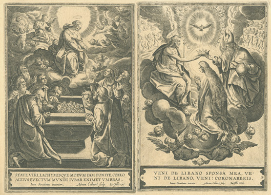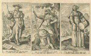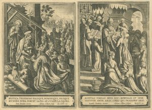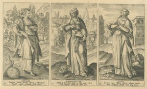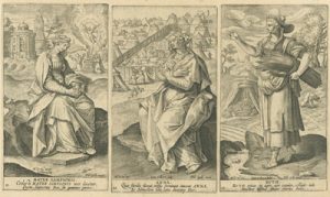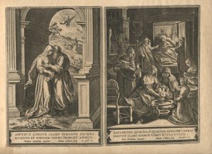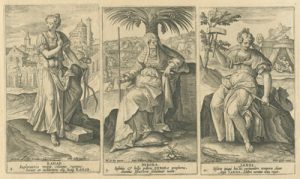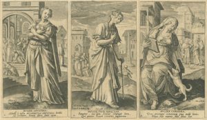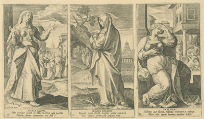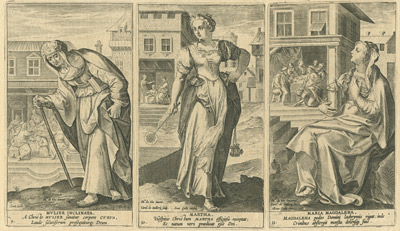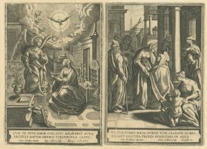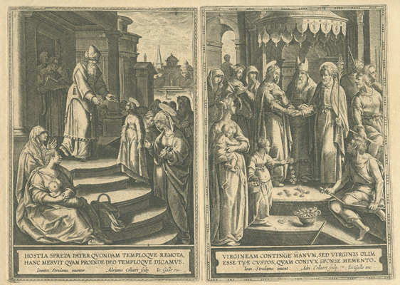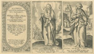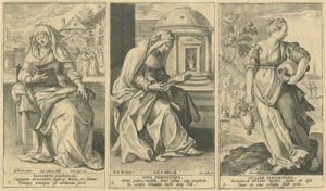 De esta última ciudad flamenca proceden las tres series grabadas a buril que ahora podemos contemplar en el Museo de las Ferias, gracias a la generosidad de D. Luis M. Ramírez Rodríguez, titular de la Colección Espínola. Las tres están dedicadas a personajes femeninos religiosos: veinte mujeres del Antiguo Testamento, quince del Nuevo y dieciséis escenas que ilustran la Vida de la Virgen María. En definitiva, un buen número de representaciones ideadas por artistas de la talla deMaarten de Vos o Ioannes Stradanus y llevadas a la estampa por grabadores tan renombrados como Adriaen Collaert o su hijo Johannes Baptista Collaert I.