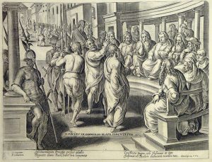 Incripciones: abajo centro, “D. PAVLVSV IN CONCILIO ALAPA PERCVTITVR. Act. 23, 2.“.Debajo, texto en latín de cuatro líneas cursivas a doble columna: Ipse Sacerdotum Princeps exosus adapta / Dogmata diuini Pauli, iubet ora loquentis / Constricto pugno cędi Tribunus at ipse / Imperat vt Paulum deducant tramite tuto. Acto. Cap. 23, 2 et 3.