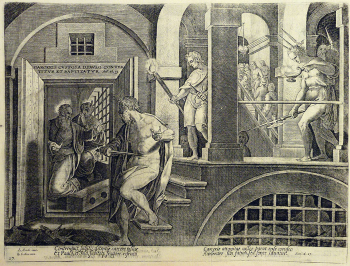 Inscripciones: en dintel de la puerta, izquierda, “CARCERIS CVSTOSA A D. PAVLO CONVER-/ TITVR ET BAPTIZATVR. Act. 16, 33.”. Debajo, texto en latín de cuatro líneas cursivas a doble columna: Contremuit subito detentis carcere tellus / Et Paulo, et Sila, subitoq(ue) fragore refracti / Carceris attonitus custos parat ense corusco / Accelerare sibi fatum, sed fonte lauatur. Acto. 16, 27.