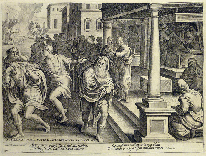 Inscripciones: abajo izquierda, “SVDARIA ET SEMICINCTIA D. PAVLI MIRACVLA PATRANT. Act. 19, 12.”. Debajo, texto en latín de cuatro líneas cursivas a doble columna: Ipsa graues tollunt Pauli sudaria morbos, / Febrilesq(ue) leuant Pauli semicincta calores. / Exorcistarum conflantur in inge libelli / Et Sathan in magicos sęuit crudeliter omnes. Acto. 19, 12.