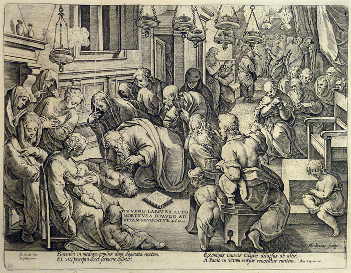 Inscripciones: abajo centro, “IVVENIS, LAPSV EX ALTO / MORTVVS, A D. PAVLO AD / VITAM REVOCATVR. Act. 20, 10.”. Debajo, texto en latín de cuatro líneas cursivas a doble columna: Protrahit in mediam paulus dum dogmata noctem, / Et vitę pręcepta docet sermone diserto: / Examinis iuuenis tabulis delapsus ab altis. / A Paulo in vitam rursus reuocatur euntem. Acto. Cap. 20, 10.