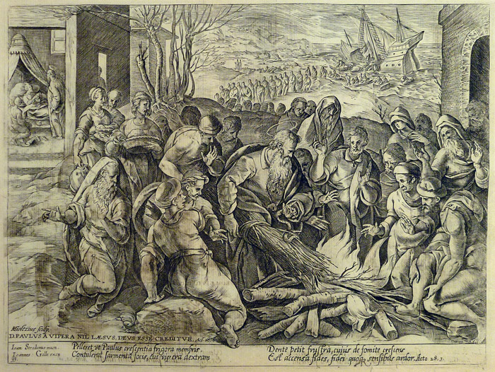 Inscripciones: abajo izquierda, “D. PAVLVS A VIPERA NIL LÆSVS, DEVS ESSE CREDITVR. Act. 28, 6.”. Debajo, texto en latín de cuatro líneas cursivas a doble columna: Pelleret vt Paulus crescentia frigora membris, / Contulerat sarmenta focis, cui vipera dextram / Dente petit frustra, cuius de fomite crescens / Est accensa fides, fidei quoq(ue) sensiblus ardor. Act. 28, 3.