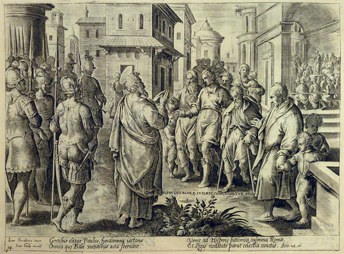 Inscripciones: “D. PAVLVS ROMÆ IVDÆIS CONCIONATVR. Act. 28, 17.”. Debajo, texto en latín de cuatro líneas cursivas a doble columna: Gentibus electus Paulus, fundamina iactans / Omnia quę Fidei virtutibus acta serenant. / Venit ad Hesperię sublimia culmina Romæ, / Et Legis nouitate parat celestia cunctis. Acto. 28, 16.