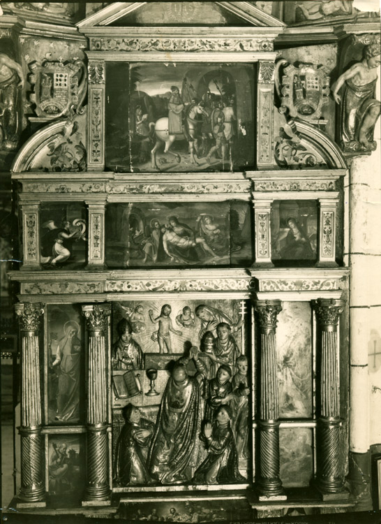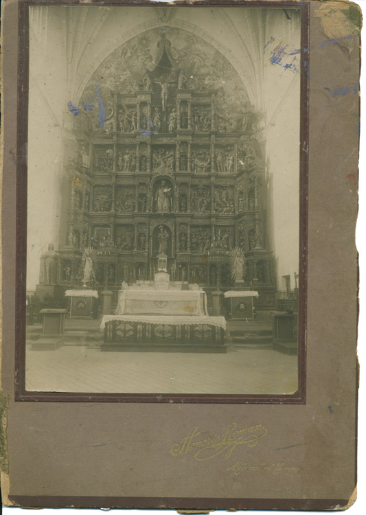 En la exposición titulada genéricamente “Fotografía histórica y Patrimonio histórico”, se ofrece una “mirada atenta” a uno de los capítulos más destacados del patrimonio artístico de Medina del Campo: las obras escultóricas y los extraordinarios retablos que se conservan fundamentalmente en sus iglesias parroquiales y conventuales. Hablamos, claro está, de los grandes retablos mayores de la Colegiata de San Antolín y las actuales parroquias de Santiago el Real, San Miguel y Santo Tomás, más los de las desaparecidas de San Martín, San Facundo y Santa María del Castillo (La Vera Cruz); los de las iglesias del Hospital de Simón Ruiz y los de las cinco clausuras de clarisas, dominicas reales, agustinas y carmelitas (masculina y femenina). También nos referimos a los conjuntos que presiden las capillas laterales de los citados templos y, junto a todos ellos, notables esculturas, hoy descontextualizadas respecto a su lugar de origen, como las del obispo Lope de Barrientos, la de San Roque peregrino o la Piedad de Juan de Juni, que afortunadamente podemos admirar en el Museo. De otra parte, también nos han interesado estructuras que muestran trabajos escultóricos, como el conjunto de yeserías de la Casa Blanca, edificada por la familia Dueñas, o la espléndida armadura mudéjar de la antigua iglesia de San Martín.