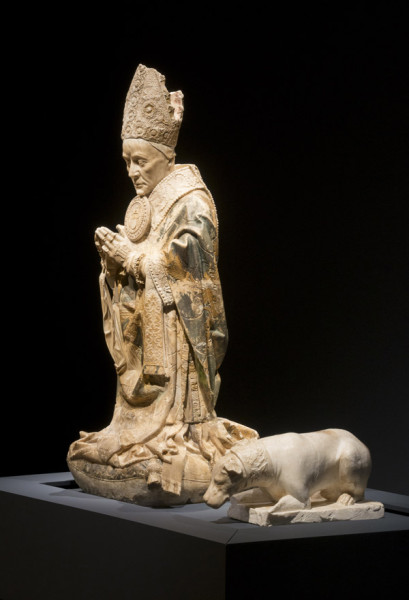 Alabastro policromado y dorado / 150x58x72 cm (figura orante), 28x33x63 cm (perro)