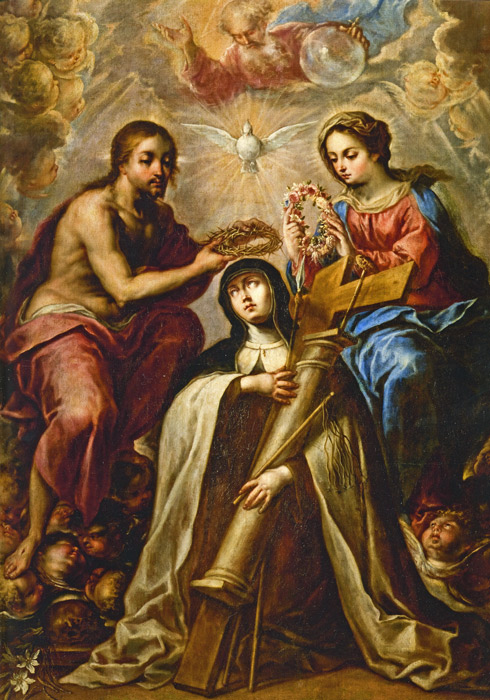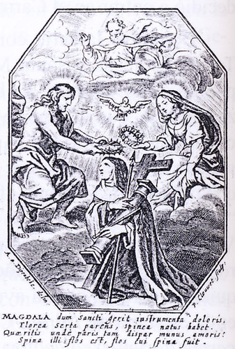 Este magnífico lienzo, firmado y fechado en el ángulo inferior izquierdo -“ANTONIO VAN Đ PERE. / FA AÑO 1670”-, fue dado a conocer por el profesor Urrea en 1977 (BSAA, XLIII. Valladolid, 1977, pp. 488-490), quien lo calificó entonces como “la obra más bella de las conocidas” de este pintor, sugiriendo su composición a partir de algún grabado de origen flamenco. En efecto, esta suposición ha quedado plenamente confirmada en el reciente artículo que Fernando Moreno Cuadro ha dedicado a los dibujos del flamenco Abraham Van Diepenbeeck (BSAA Arte. Valladolid, 2013, pp. 157-182). Dichos dibujos, llevados a la estampa por reconocidos grabadores de la misma procedencia, ilustran el libro Les peintures sacrées du Temple du Carmel (1660), auténtico tesoro iconográfico carmelitano. Las veintiséis representaciones (incluida la portada) de los santos fundadores y reformadores de la Orden concluyen con una dedicada a Santa María Magdalena de Pazzi (1566-1607), precisamente en esta escena de su doble coronación: de espinas por Jesucristo y de flores por la Virgen María, en evidente referencia alegórica a su glorificación. La inspiración de las imágenes de esta serie corresponde al padre Gracián de San Elías, sus diseños al ya citado Diepenbeeck y la labor de estampación, en nuestro caso -ya que intervienen varios grabadores-, a Pierre Clouwet.