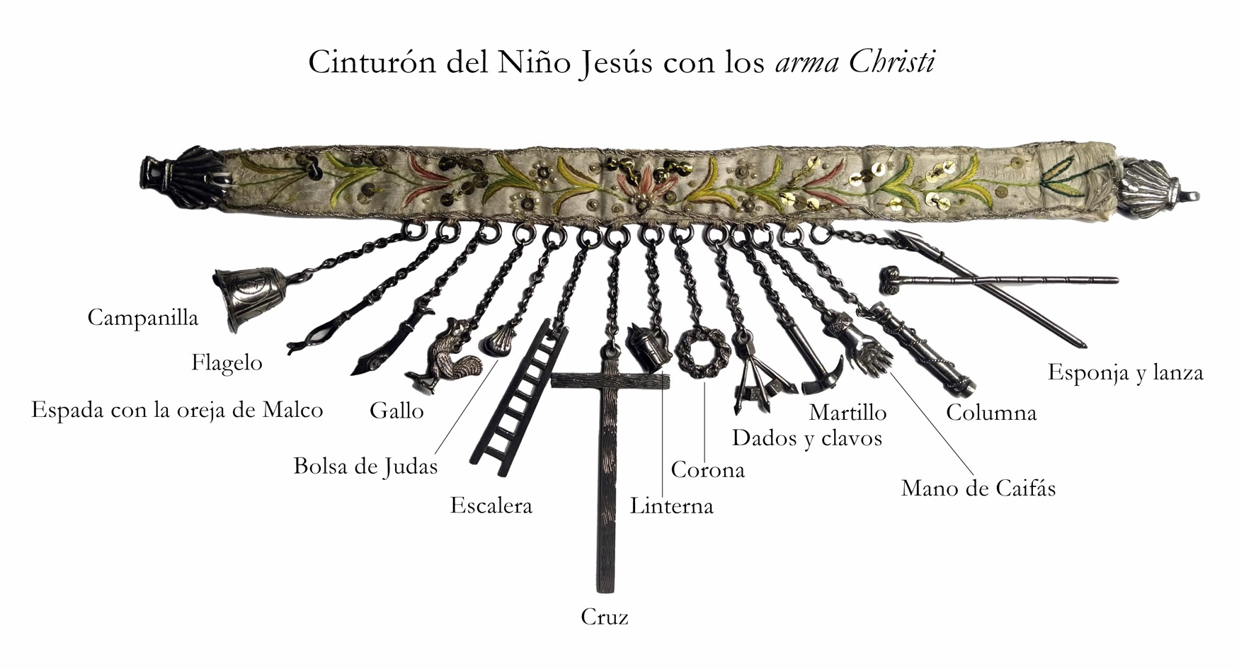 La relevancia en esta ocasión se encuentra en el magnífico cinturón de seda bordada con añadidos de lentejuelas y perlas, del que penden catorce cadenillas de plata con hasta 18 símbolos de Pasión (tras la última restauración de la obra realizada en el Museo de las Ferias). De izquierda a derecha aparecen en primer lugar una campanilla grabada con el Sol y la Luna, seguido por el flagelo, la espada con oreja en la tercera; la cuarta con el gallo de San Pedro; la quinta con la bolsa de Judas; la sexta sostiene la escalera; la séptima lógicamente la cruz; la octava una linterna para el prendimiento. La corona de espinas está en la novena, la décima mantiene los tres clavos unidos a los dados. Le sigue en la undécima el martillo y en las tres últimas están: la mano que le abofeteó, la columna de fuste alto con cuerda alrededor y la lanza y caña con esponja.