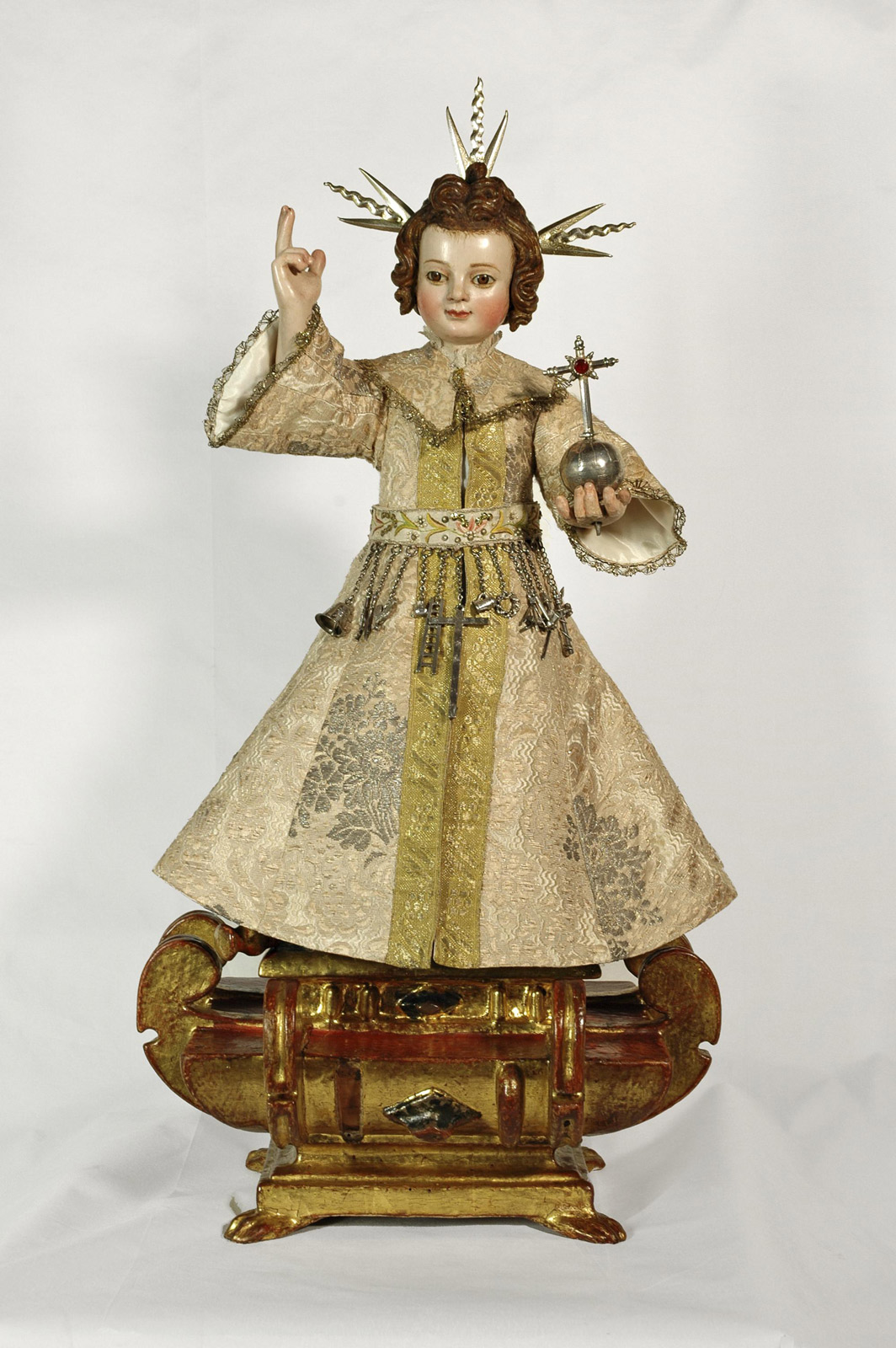 Madera tallada y policromada. Brocado. Pasamanería. Plata fundida, repujada y cincelada