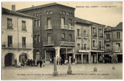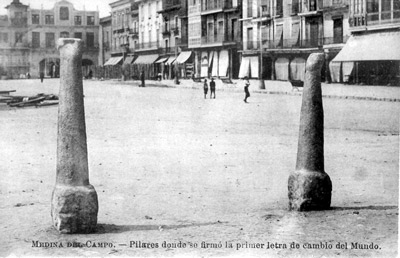 Los pilares aparecen en antiguas fotografías de la Plaza Mayor frente a la antigua acera de la Especiería o del Peso y, en algunos casos, con un pie de foto que alude al «sitio donde se supone se firmó la primera letra de cambio del mundo», hecho que, como bien sabemos, carece de rigor histórico ya que varios siglos atrás este documento mercantil era bien conocido por genoveses, florentinos y otros banqueros italianos, especialmente los de la Toscana. Este argumento sirvió para que en mayo de 1965 –precisamente hace ahora 50 años-, en la propia Plaza Mayor, el Ayuntamiento dedicara un sencillo monumento a las ferias y más particularmente a la letra de cambio, utilizando estos dos pilares que comentamos junto con cuatro antiguos capiteles y una lápida de nueva factura con un texto del entonces Cronista de la Villa, D. Mariano García Sánchez, que alude a la cristalización de este instrumento financiero en las ferias medinenses y su estrecha ligazón a nuestra localidad.