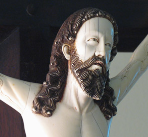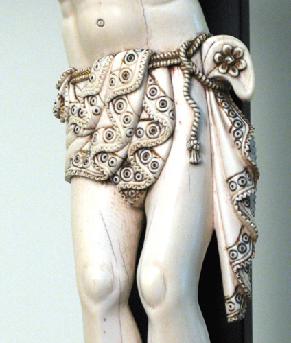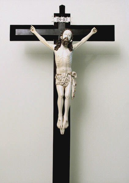 Expirante, con la boca entreabierta y mirada hacia lo alto, presenta el rostro ovalado, frente despejada, arcos superciliares poco destacados, ojos rasgados y párpados abultados sin doble brida. La nariz, recta con aletas carnosas, evidencia una influencia occidental. Pero lo más destacado de esta pieza indo-portuguesa es tanto el cabello como la barba. La principal característica es la talla biselada y zigzagueante. Los mechones de ambos elementos se configuran con carácter geométrico terminando en los típicos «caracolillos». Es destacable la presencia de la «mosca» en la barbilla y los pabellones auditivos afrontados, que denotan una cronología propia del siglo XVII. Los brazos presentan cierta verticalidad, con las típicas venas en resalte de forma esquematizada y composición simétrica. Conviene destacar que la unión al tronco se realiza a través de la axila, sin prolongar los hombros, al igual que en los crucificados hispano-filipinos, y de forma distinta a todas las demás piezas occidentales. El tórax, con sentido sumario, presenta arco ventral apuntado con evidencia de costillas tanto en la parte anterior como posterior, pero sin pormenorizar. Junto con la cabeza, el otro elemento peculiar de la eboraria indo-portuguesa es el cendal, que está sujeto con doble cordón retorcido dejando al descubierto la cadera para recoger la «moña» en su lado izquierdo. Pero lo específico es la decoración a base de círculos concéntricos y terminación dentada en los particulares «dientes de sierra». Otra particularidad de este Cristo es la presencia de cuatro clavos, con los pies separados, no sobrepuestos. Son pocos los ejemplares que se conocen con esta disposición tanto en Portugal como en España. Este tipo de piezas se realizaban principalmente en Goa, bajo la demanda portuguesa, para remitirlas a la metrópoli, pero talladas por artistas indios cuya tradición escultórica en marfil era multisecular y ampliamente contrastada. Cronológicamente, la obra corresponde a los últimos años de decimoséptima centuria, destacando en ella la ausencia de la corona tallada, la «mosca vertical» y el cendal reducido y decorado.