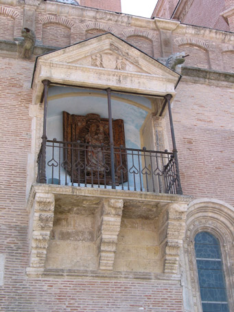 El «balcón del Pópulo» se construyó entre los años 1516 y 1523 como segundo altar de la capilla interior del mismo título (que se encuentra situada en la cabecera de la nave del Evangelio) con la que se comunica directamente por una angosta escalera. En las disposiciones fundacionales, dictadas por García del Rincón el 15 de marzo de 1516, se recoge la función primordial de este altarcillo exterior, abierto hacia la Plaza Mayor: ser el lugar desde donde se celebrara la misa los días de feria que no fueran festivos, para que los mercaderes no tuvieran que ausentarse de sus tiendas y negocios. Un fragmento del texto original dice lo siguiente (refundimos parte de los capítulos II y IV):